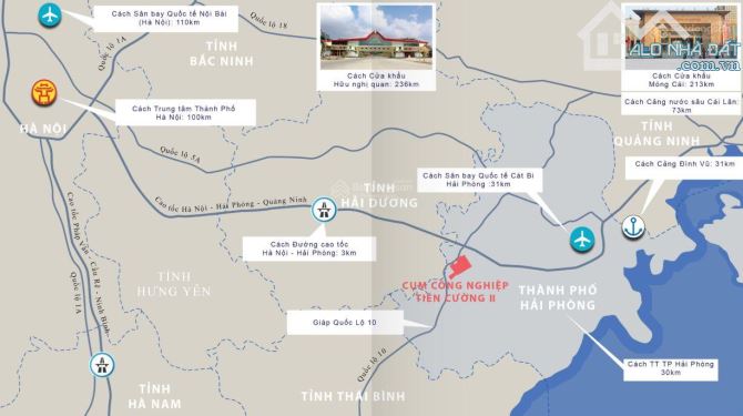 Cách cảng Đình Vũ 30 km, sân bay Cát Bi 20 km.